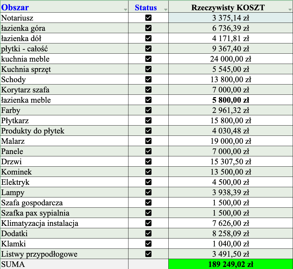 W poniższej tabeli znajdziesz zestawienie rzeczywistych  kosztów, które ponieśliśmy podczas wykańczania naszego domu o powierzchni 120 mkw.